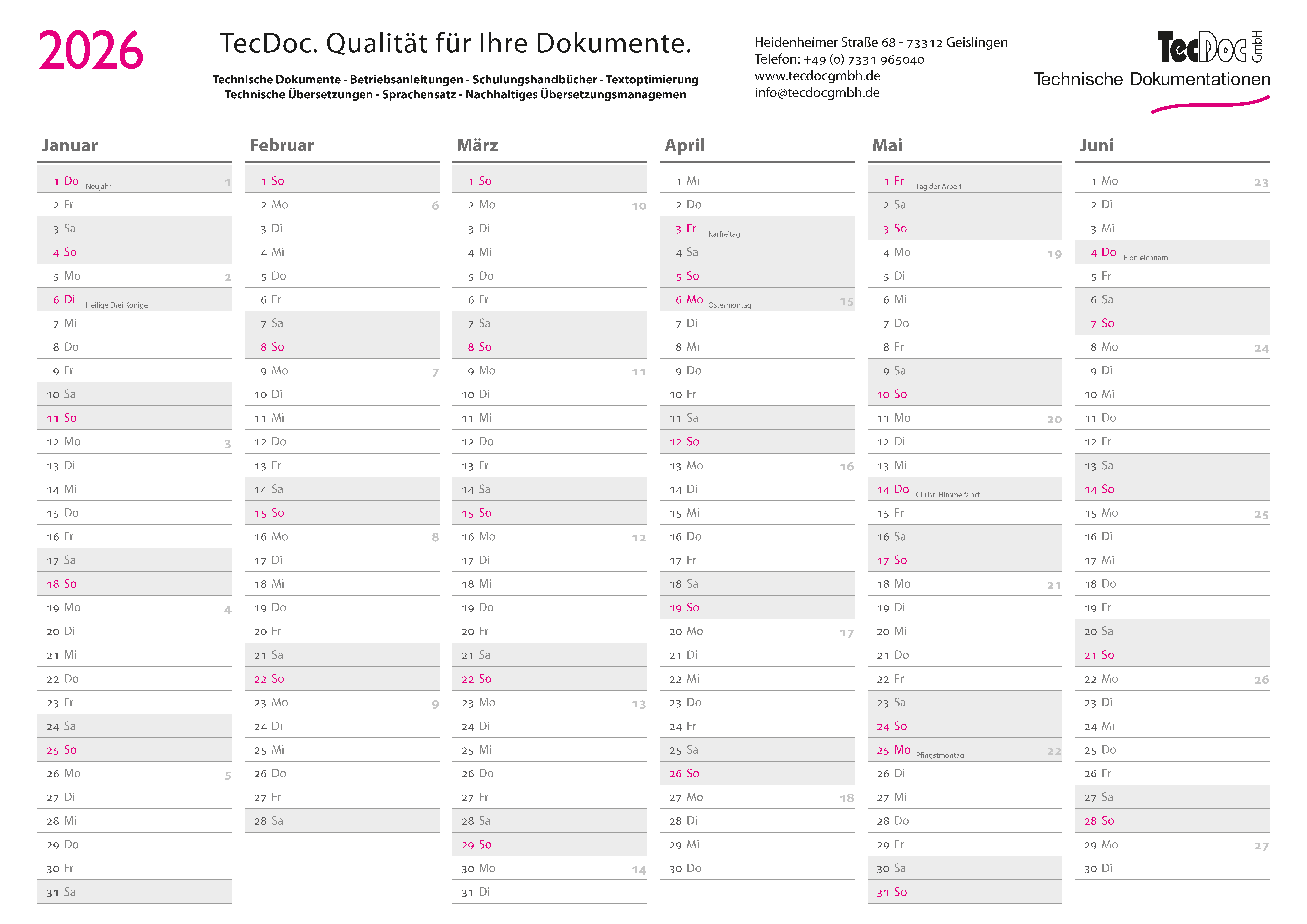 Hier erhalten Sie einen pdf-Kalender für das Jahr 2026. In die Felder können Sie kurze Anmerkungen eintragen und speichern. Ein Ausdruck ist möglich.